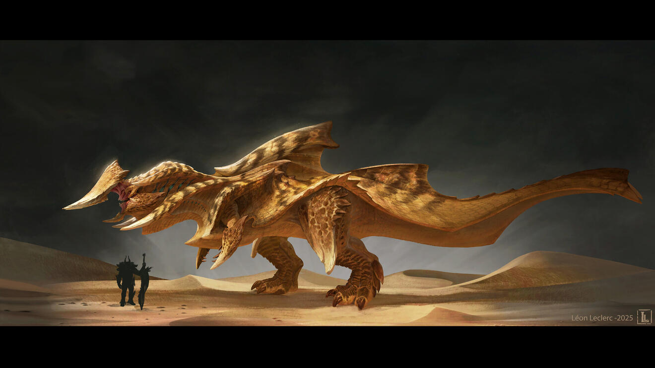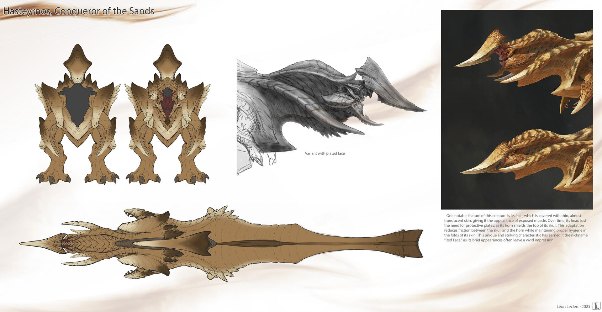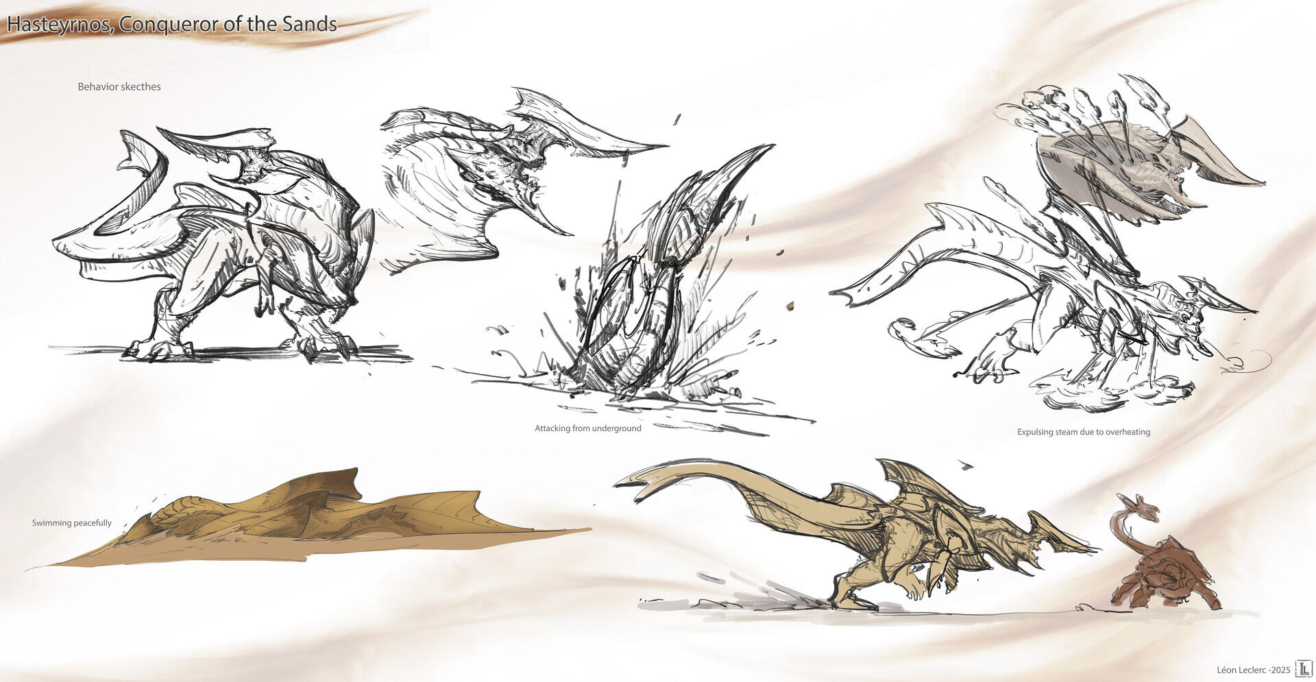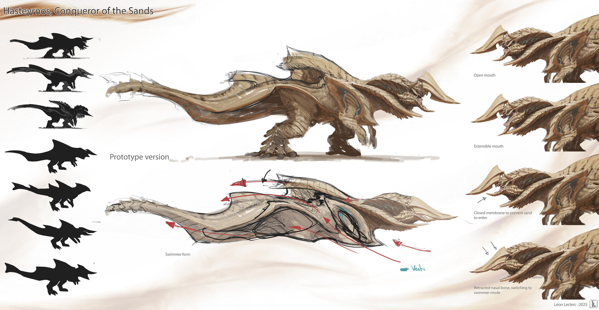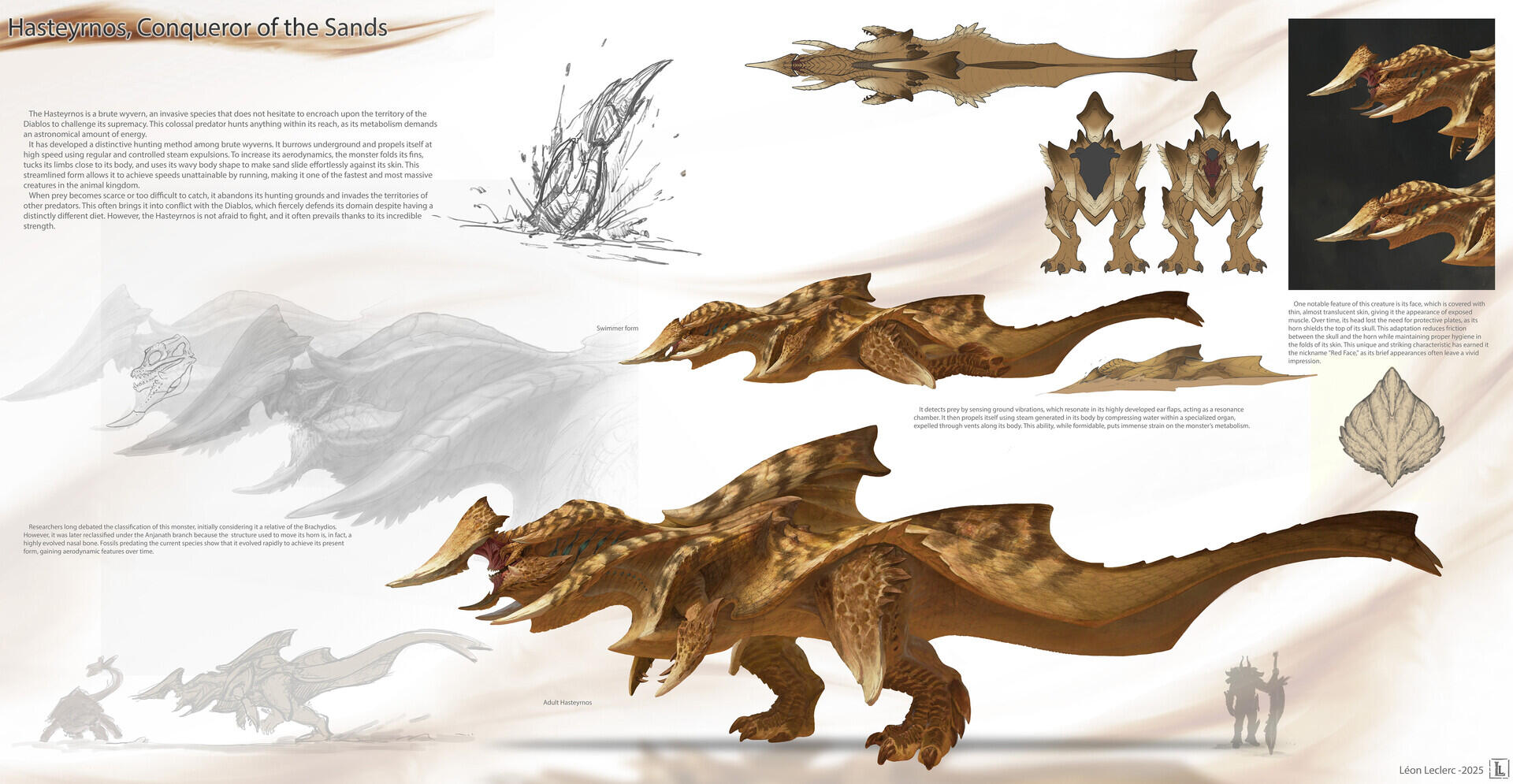 I designed this creature for a personal project set in an action-RPG game context, focused on boss fights. To give a frame of reference, think of games like The Witcher 3 or Monster Hunter, where the player faces off against forces of nature within a realistic fantasy setting—meaning a world with internally consistent rules that echo elements of the real world.The Hasteyrnos was designed around several core ideas: a dinosaur-inspired foundation with a behavioral twist that adds a touch of fantasy; a cyclical gameplay structure built on three distinct phases, allowing the player to learn and master the creature's patterns; and the concept of a monster that behaves like a machine—using steam to propulse itself through sand—without necessarily looking like one.To further elaborate on the idea of steam-based propulsion, the internal system of the Hasteyrnos can be compared to that of a locomotive. A massive quantity of water is stored and pressurized within specialized organs, generating steam. Once the pressure reaches its peak, the steam is expelled through a network of pores running along its back and beneath its dorsal fin. This mechanism allows the creature to reach impressive bursts of speed while moving beneath the sand, as if it were swimming through it.