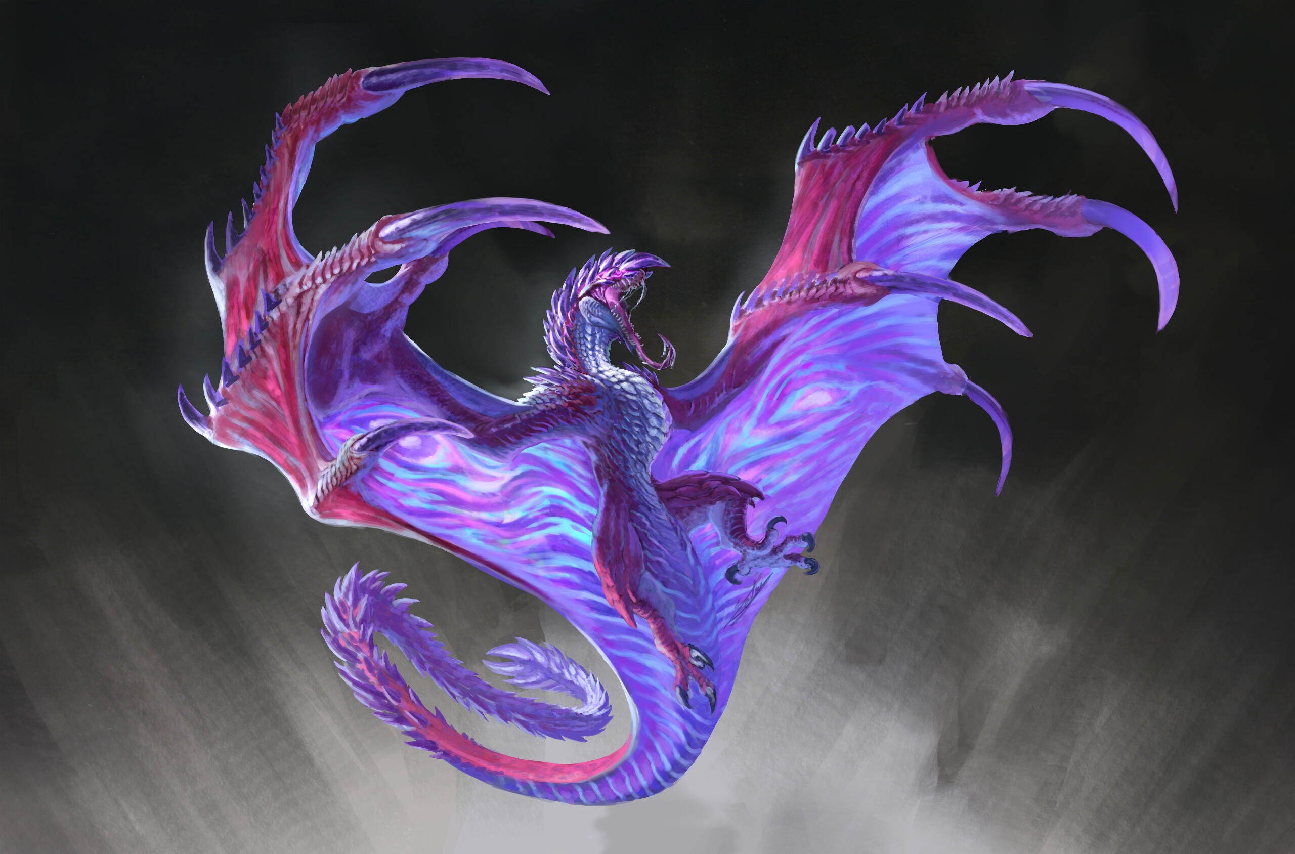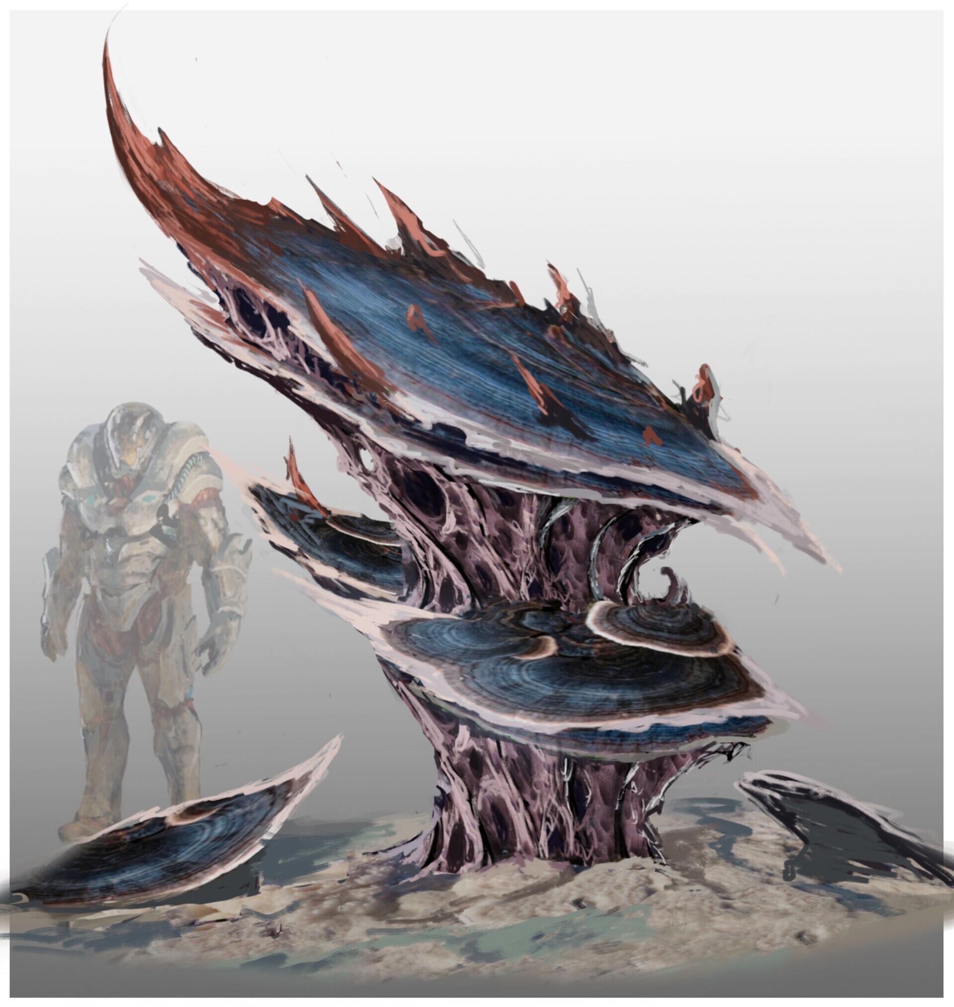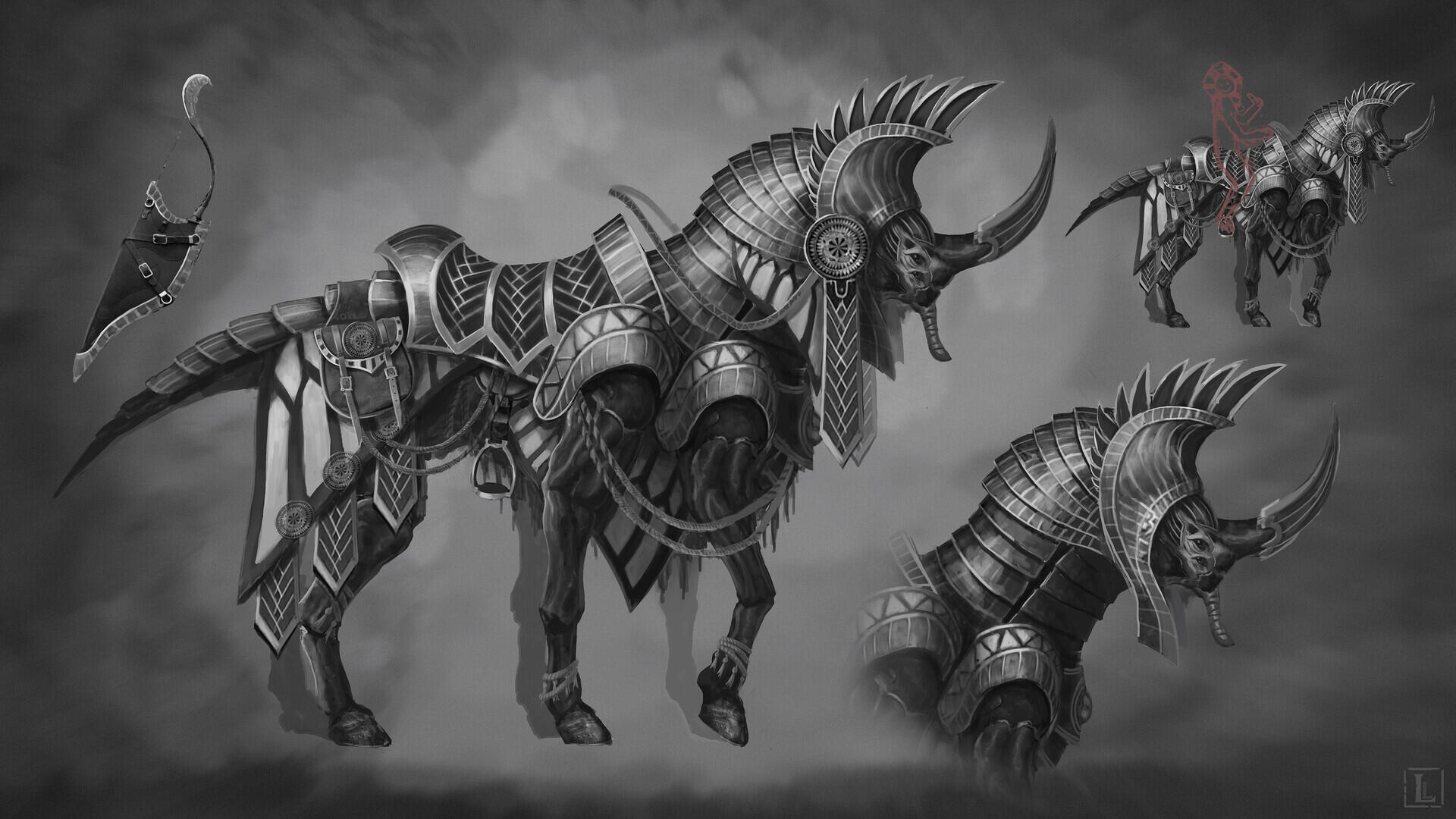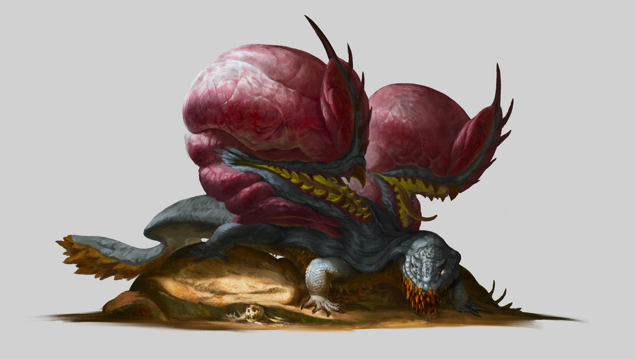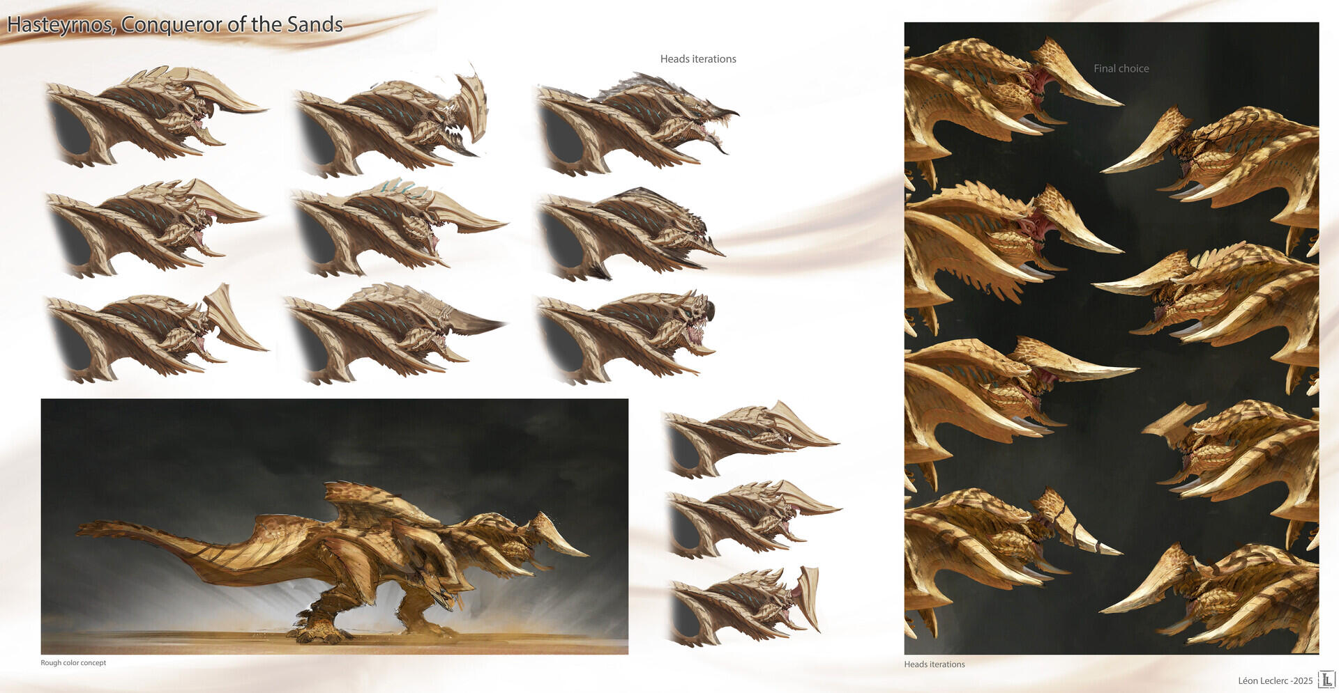 I designed this creature for a personal project set in an action-RPG game context, focused on boss fights. To give a frame of reference, think of games like The Witcher 3 or Monster Hunter, where the player faces off against forces of nature within a realistic fantasy setting—meaning a world with internally consistent rules that echo elements of the real world.The Hasteyrnos was designed around several core ideas: a dinosaur-inspired foundation with a behavioral twist that adds a touch of fantasy; a cyclical gameplay structure built on three distinct phases, allowing the player to learn and master the creature's patterns; and the concept of a monster that behaves like a machine—using steam to propulse itself through sand—without necessarily looking like one.To further elaborate on the idea of steam-based propulsion, the internal system of the Hasteyrnos can be compared to that of a locomotive. A massive quantity of water is stored and pressurized within specialized organs, generating steam. Once the pressure reaches its peak, the steam is expelled through a network of pores running along its back and beneath its dorsal fin. This mechanism allows the creature to reach impressive bursts of speed while moving beneath the sand, as if it were swimming through it.