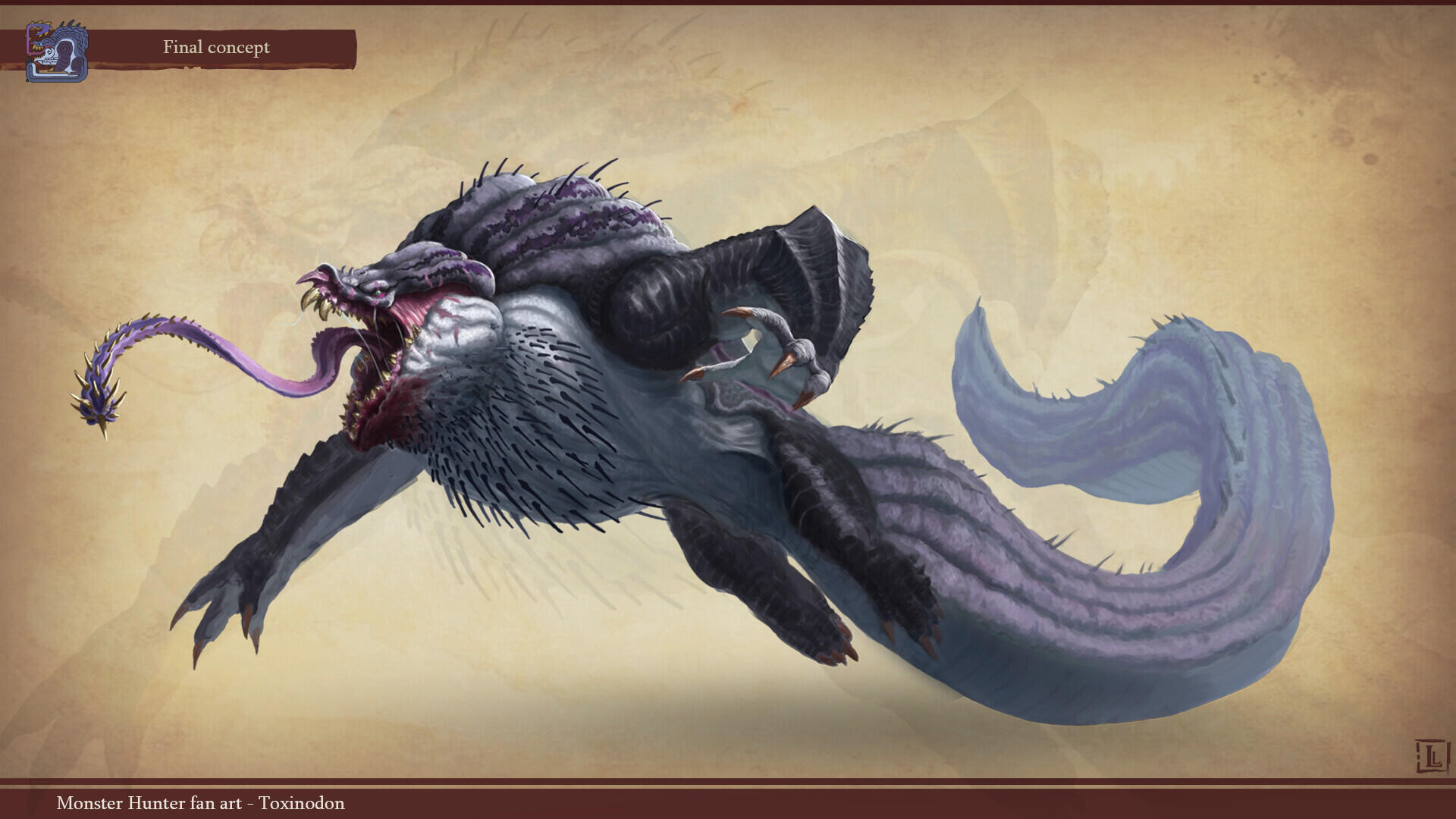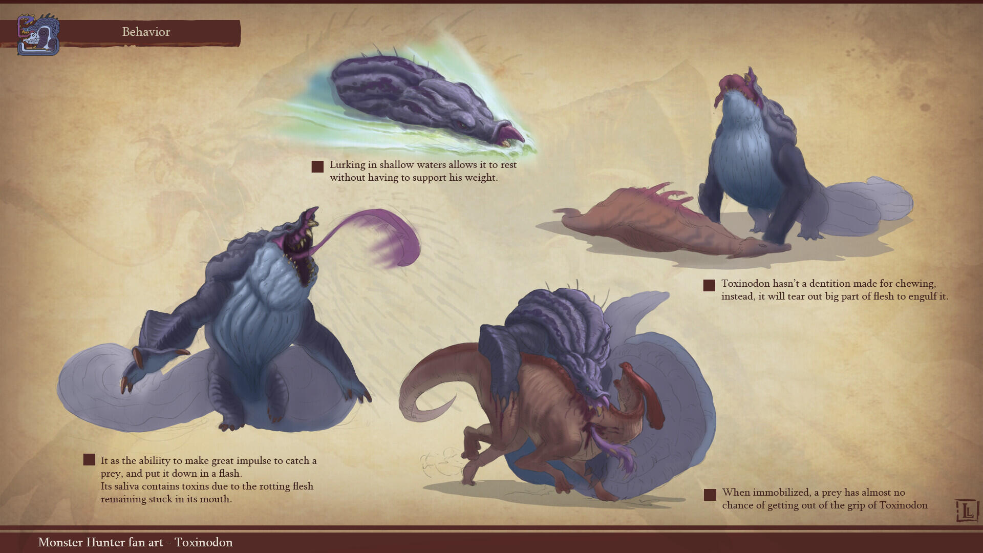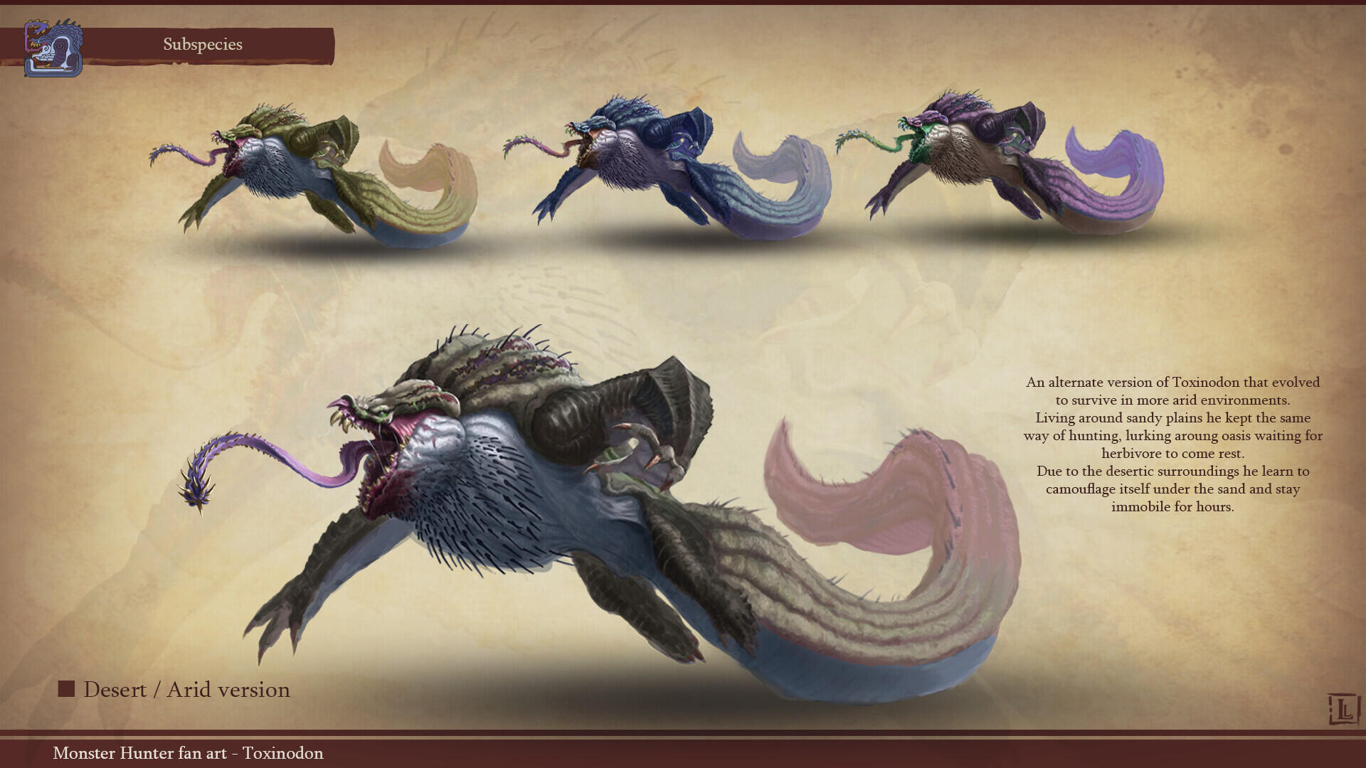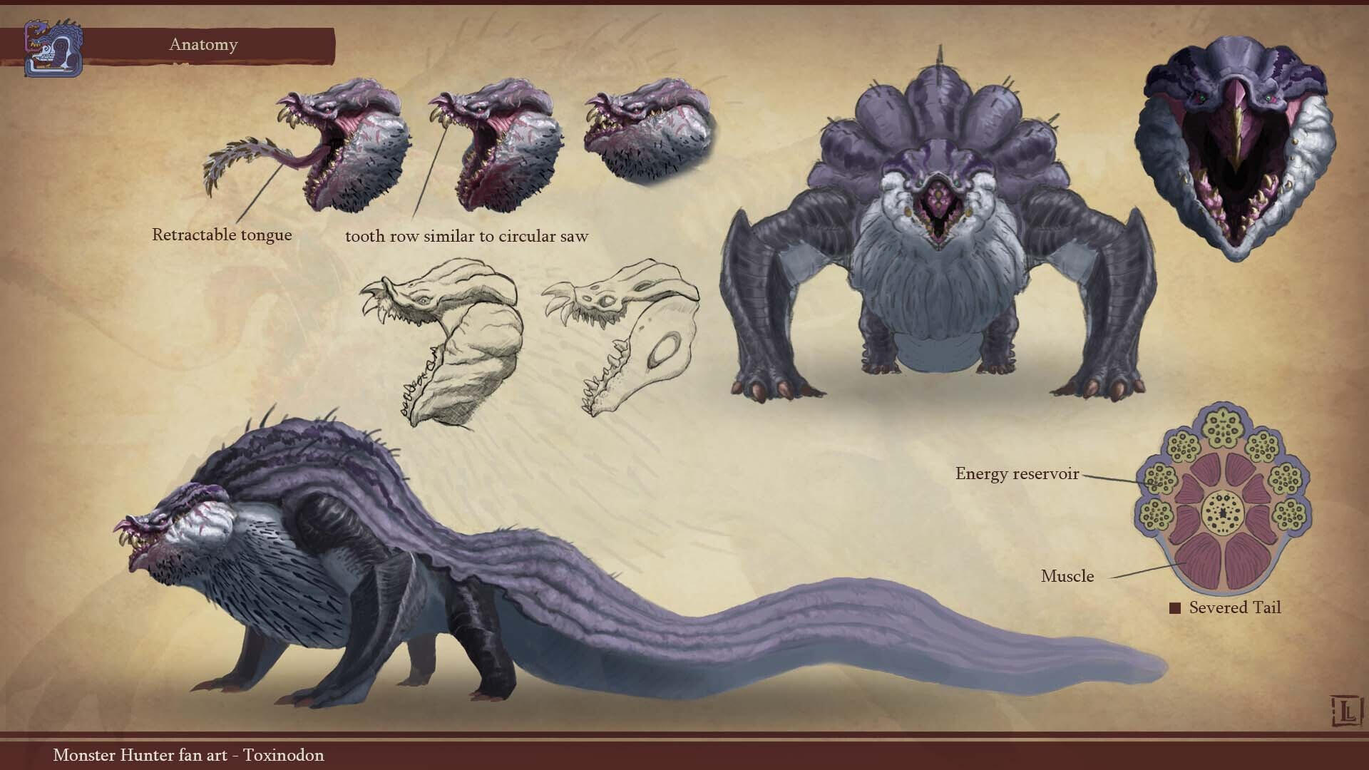 This is a project I completed a few years ago, with the goal of designing a monster that could fit within the Monster Hunter game series. The concept behind this design was to create a small-sized creature that could nonetheless pose a serious threat to more experienced players. The core of the combat strategy revolves around a simple rule: never face the monster head-on.The design highlights two main features: a sharp-toothed maw and a prominent tail that’s meant to draw the player’s attention. This tail serves as an obvious weak spot, both visually and in gameplay terms, as the monster has very limited means of protecting this large, trailing appendage.The tail actually serves as an organ for storing nutrients. Due to its body structure, the creature is poorly adapted for chasing prey and instead relies on ambush tactics. It hides in shallow waterways, lying in wait for its next unsuspecting victim. While this hunting method yields limited success, it has been compensated over time by the development of this storage organ, allowing the beast to survive for several weeks without feeding.
