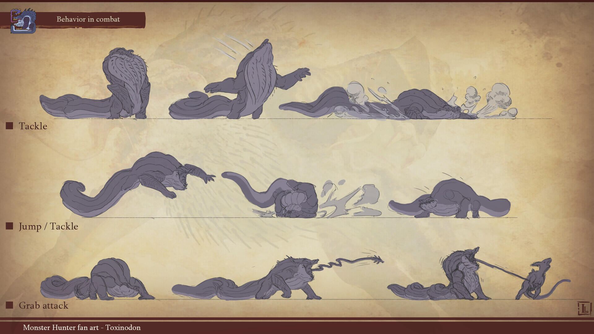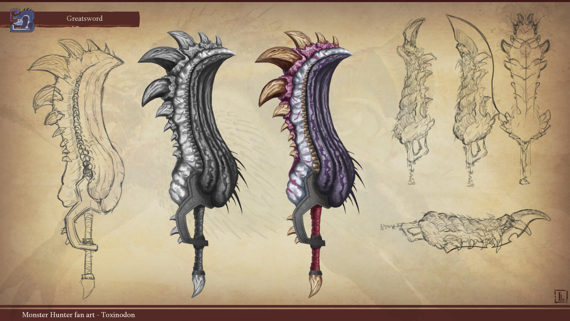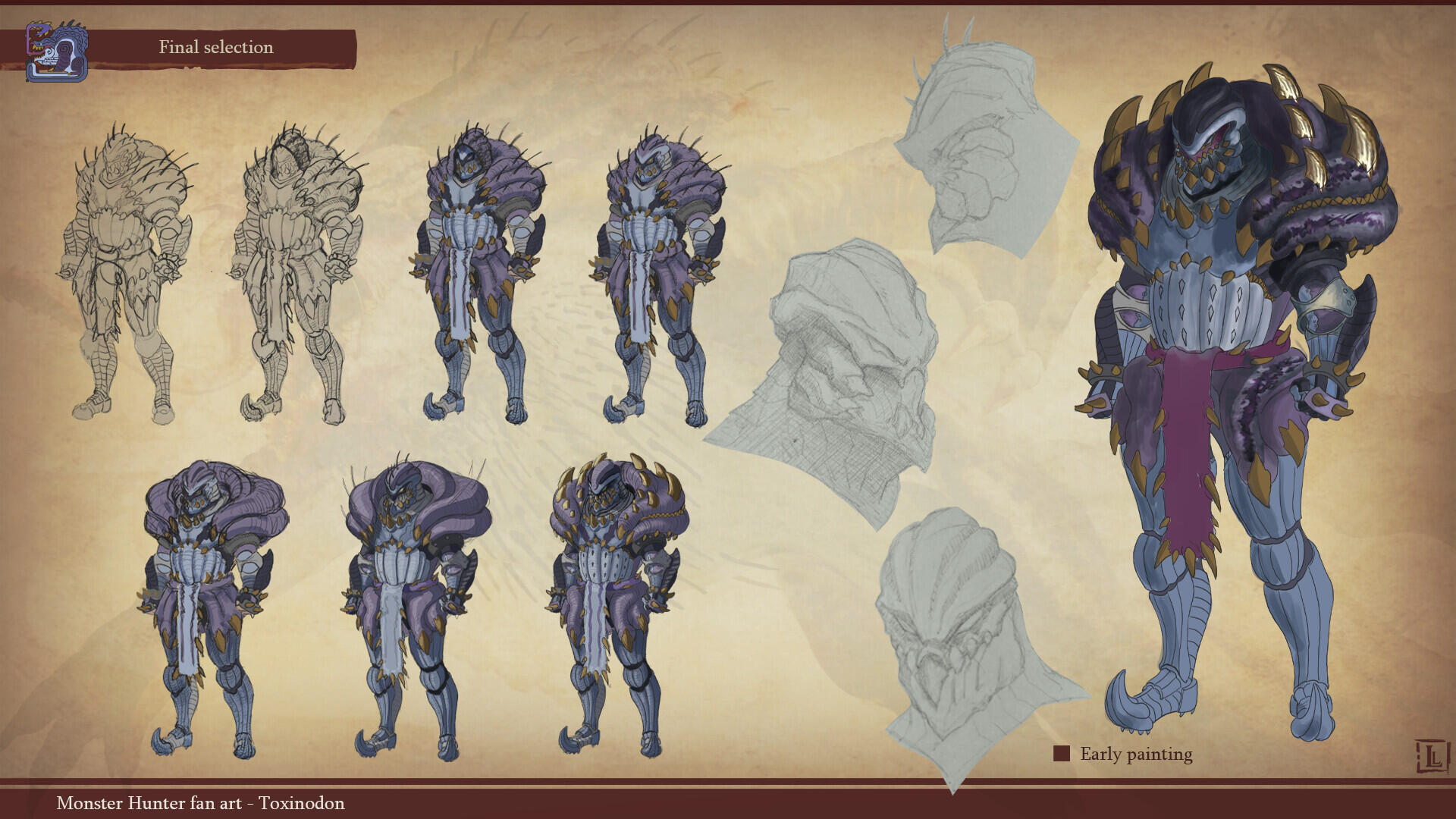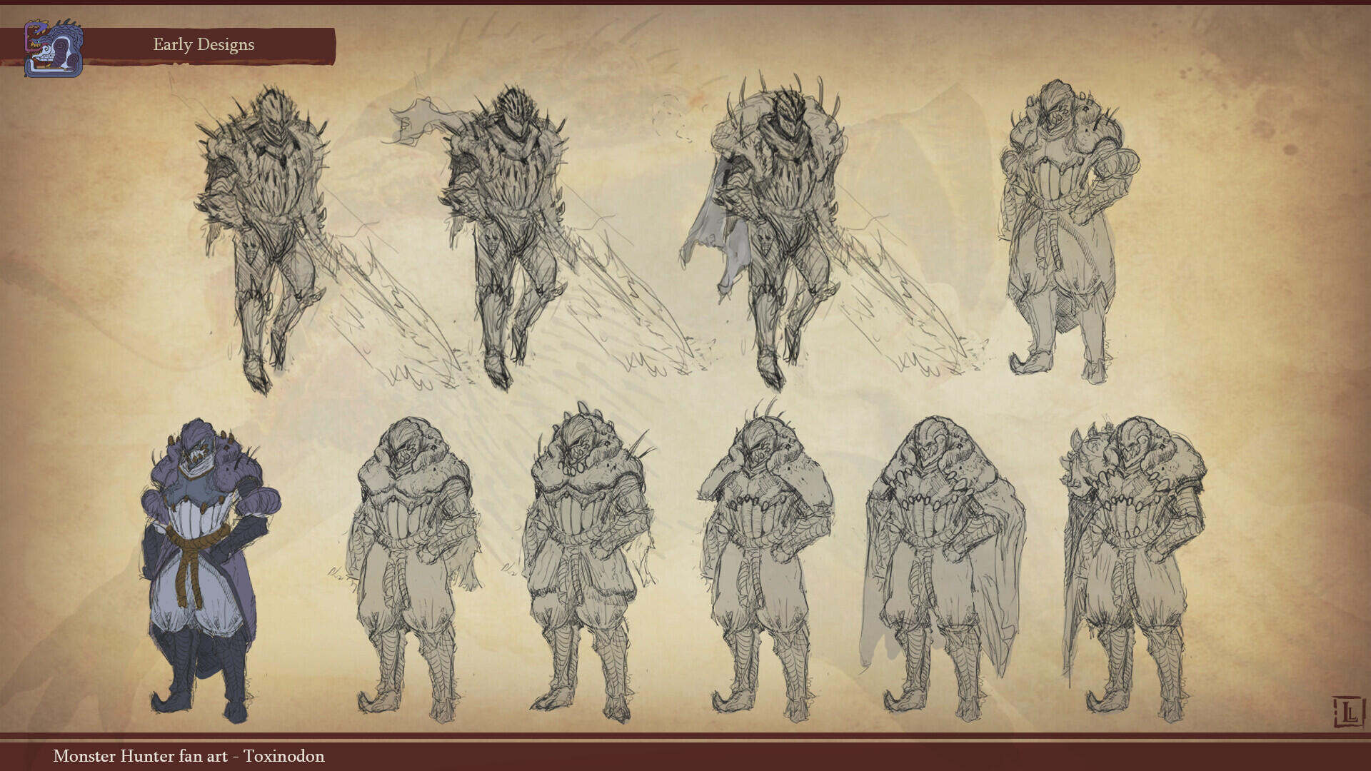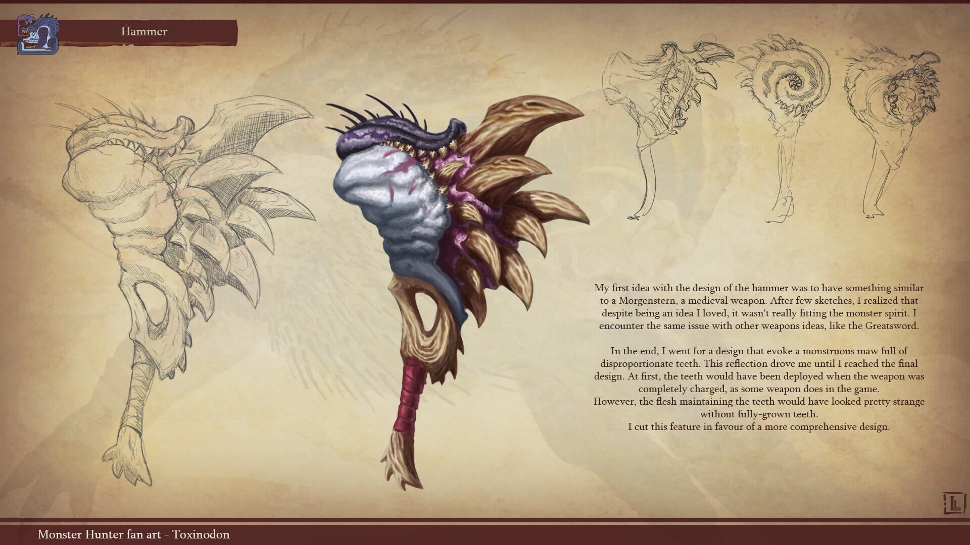 This is a project I completed a few years ago, with the goal of designing a monster that could fit within the Monster Hunter game series. The concept behind this design was to create a small-sized creature that could nonetheless pose a serious threat to more experienced players. The core of the combat strategy revolves around a simple rule: never face the monster head-on.The design highlights two main features: a sharp-toothed maw and a prominent tail that’s meant to draw the player’s attention. This tail serves as an obvious weak spot, both visually and in gameplay terms, as the monster has very limited means of protecting this large, trailing appendage.The tail actually serves as an organ for storing nutrients. Due to its body structure, the creature is poorly adapted for chasing prey and instead relies on ambush tactics. It hides in shallow waterways, lying in wait for its next unsuspecting victim. While this hunting method yields limited success, it has been compensated over time by the development of this storage organ, allowing the beast to survive for several weeks without feeding.