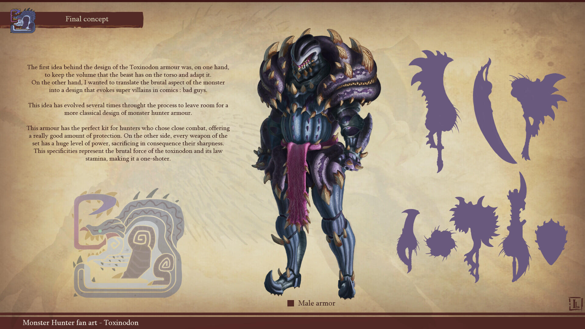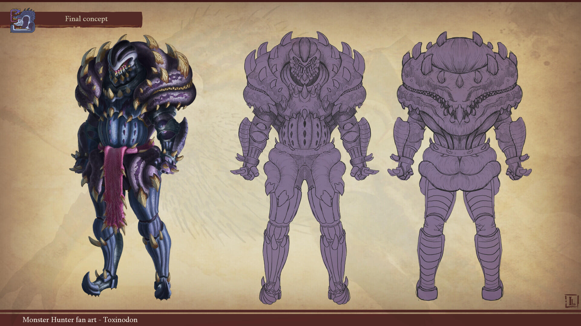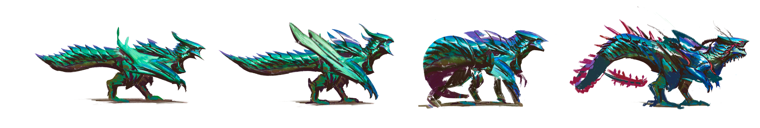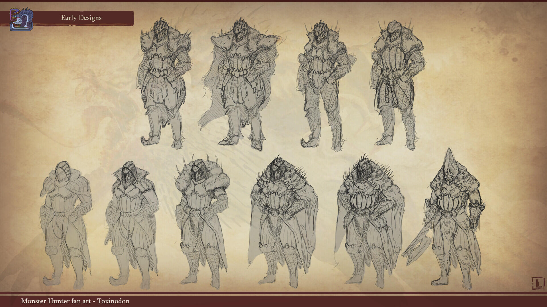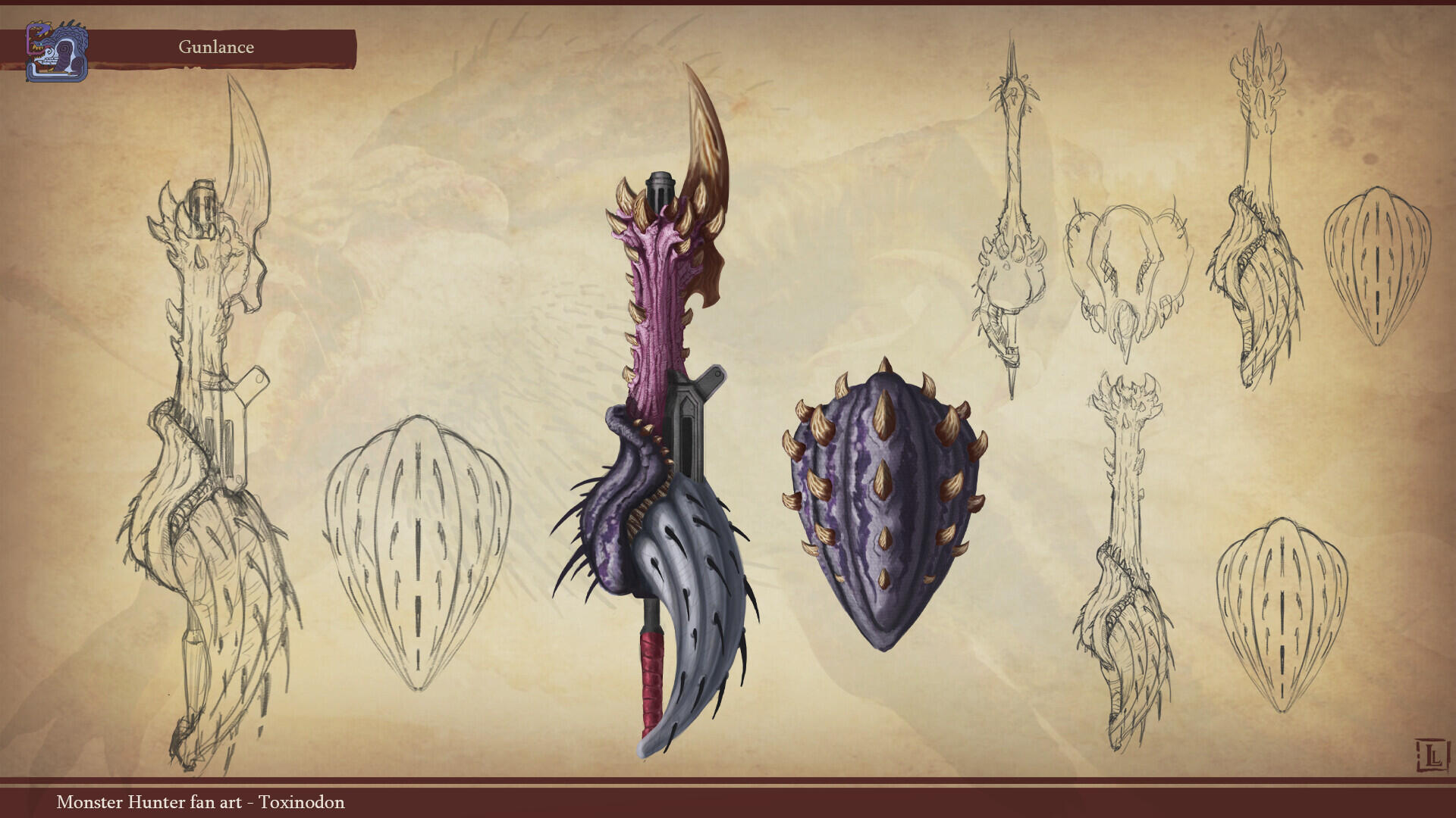 This is a project I completed a few years ago, with the goal of designing a monster that could fit within the Monster Hunter game series. The concept behind this design was to create a small-sized creature that could nonetheless pose a serious threat to more experienced players. The core of the combat strategy revolves around a simple rule: never face the monster head-on.The design highlights two main features: a sharp-toothed maw and a prominent tail that’s meant to draw the player’s attention. This tail serves as an obvious weak spot, both visually and in gameplay terms, as the monster has very limited means of protecting this large, trailing appendage.The tail actually serves as an organ for storing nutrients. Due to its body structure, the creature is poorly adapted for chasing prey and instead relies on ambush tactics. It hides in shallow waterways, lying in wait for its next unsuspecting victim. While this hunting method yields limited success, it has been compensated over time by the development of this storage organ, allowing the beast to survive for several weeks without feeding.