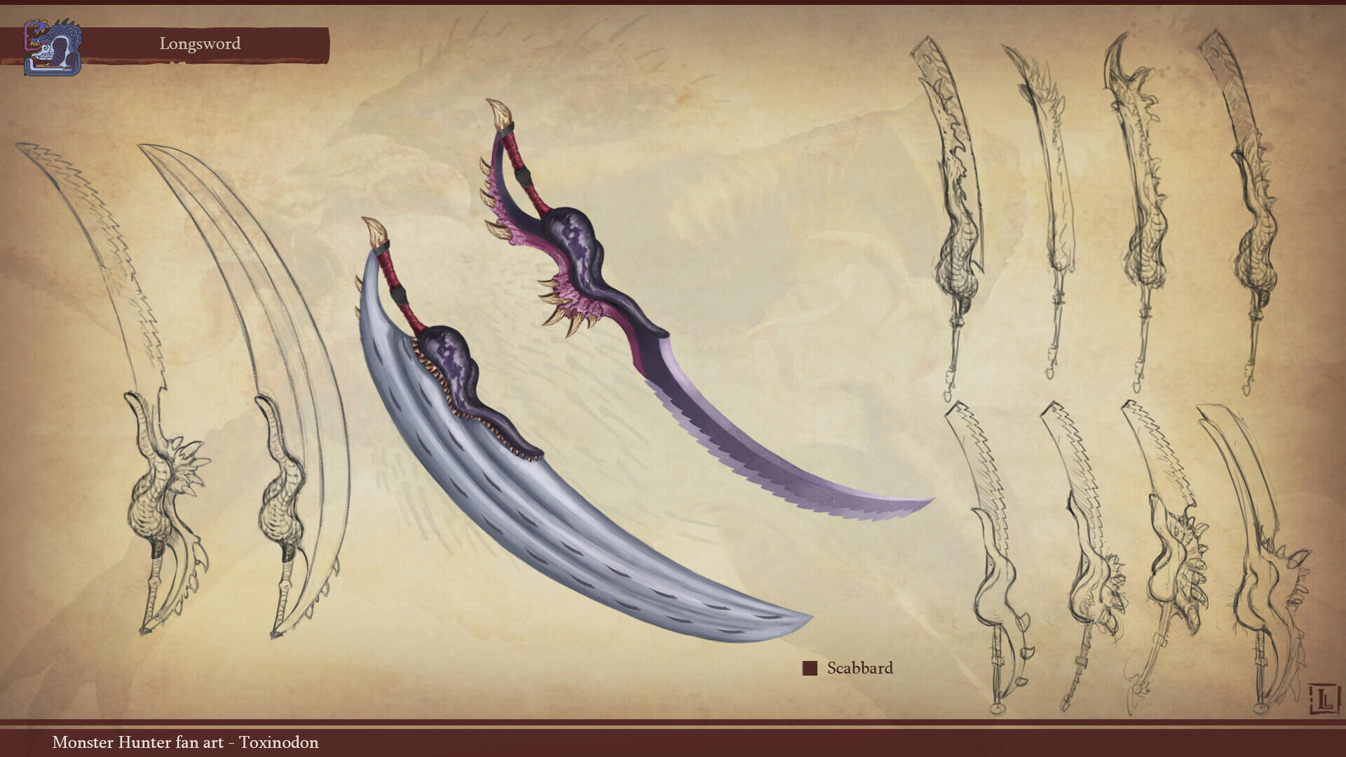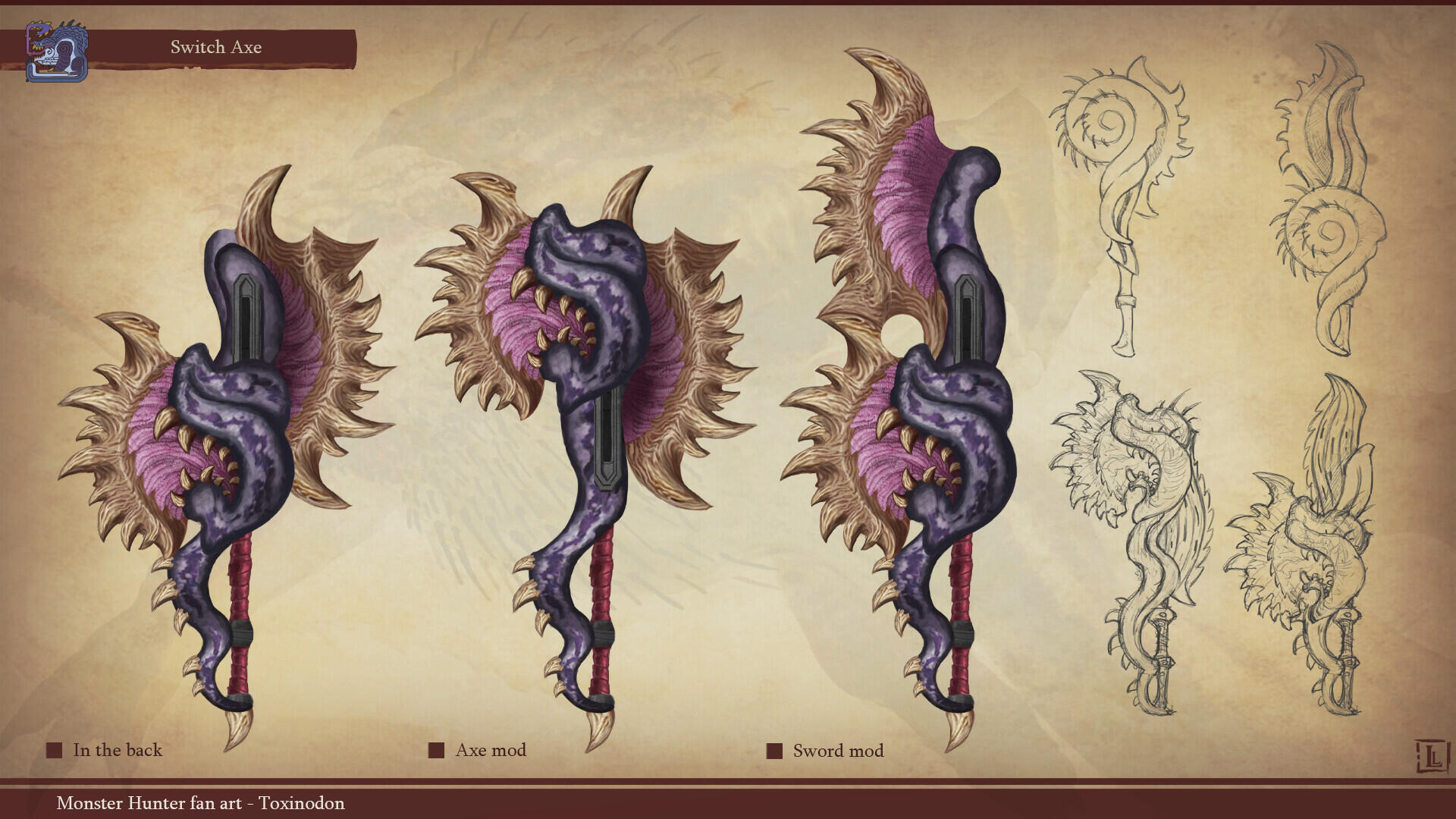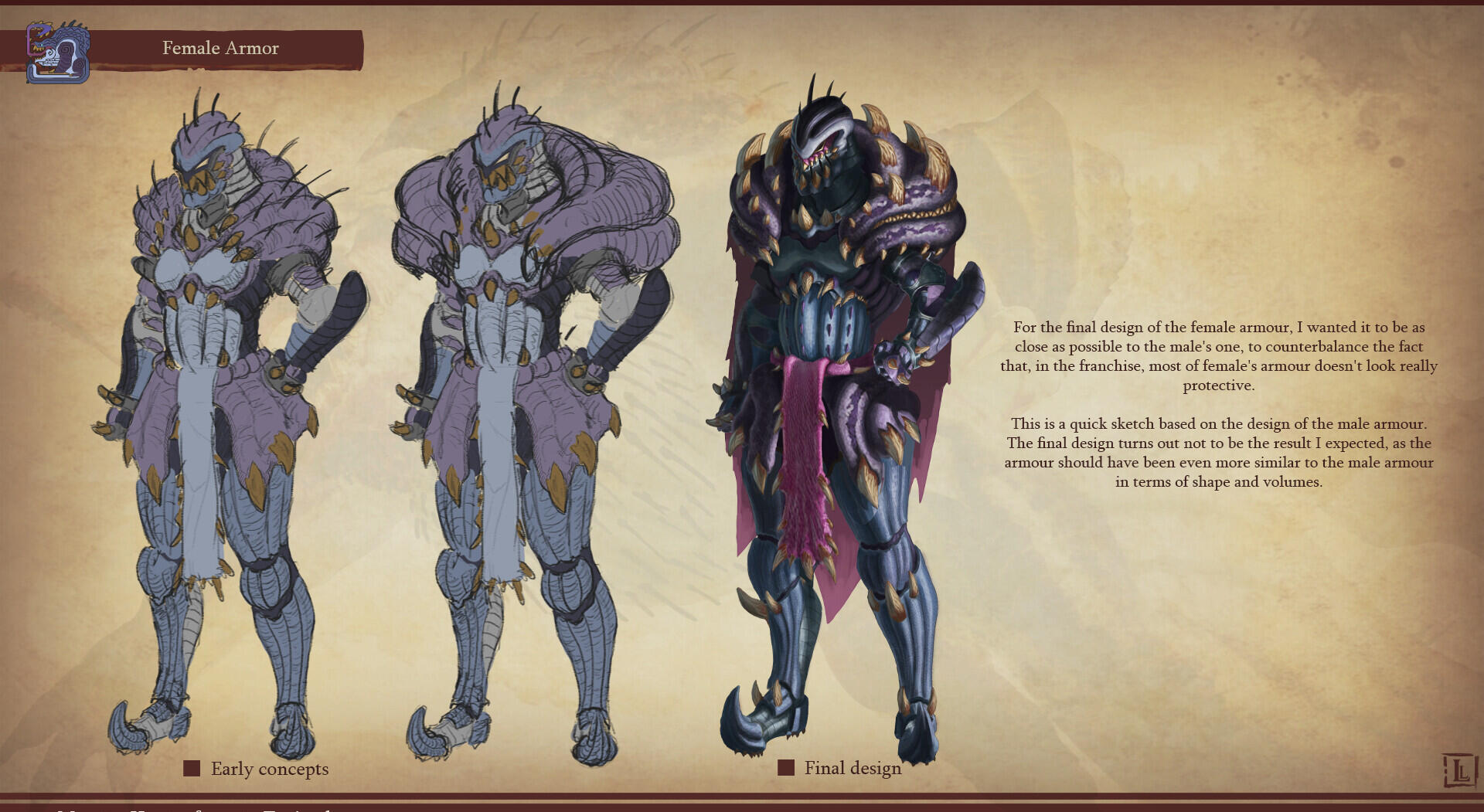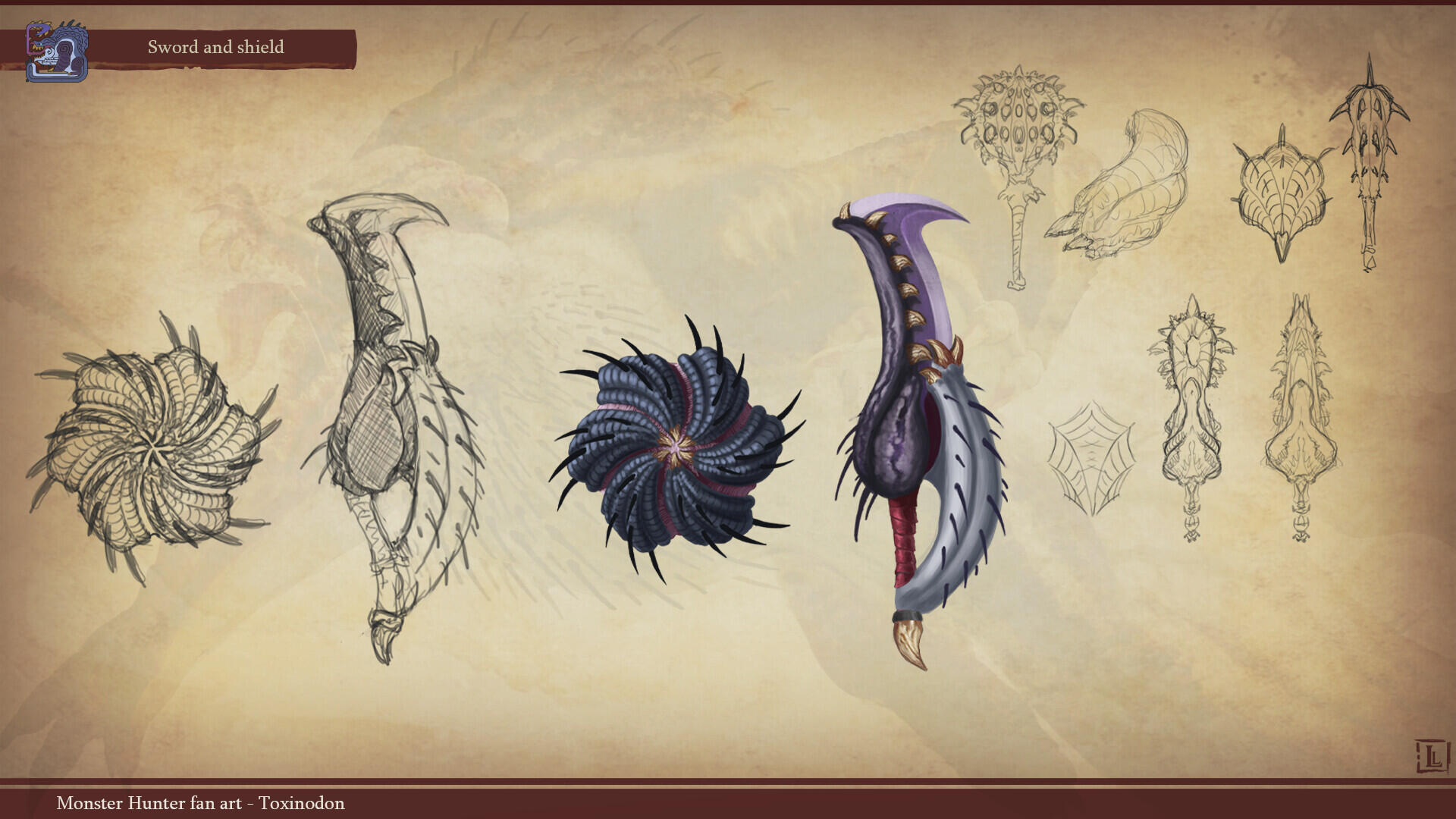 This is a project I completed a few years ago, with the goal of designing a monster that could fit within the Monster Hunter game series. The concept behind this design was to create a small-sized creature that could nonetheless pose a serious threat to more experienced players. The core of the combat strategy revolves around a simple rule: never face the monster head-on.The design highlights two main features: a sharp-toothed maw and a prominent tail that’s meant to draw the player’s attention. This tail serves as an obvious weak spot, both visually and in gameplay terms, as the monster has very limited means of protecting this large, trailing appendage.The tail actually serves as an organ for storing nutrients. Due to its body structure, the creature is poorly adapted for chasing prey and instead relies on ambush tactics. It hides in shallow waterways, lying in wait for its next unsuspecting victim. While this hunting method yields limited success, it has been compensated over time by the development of this storage organ, allowing the beast to survive for several weeks without feeding.