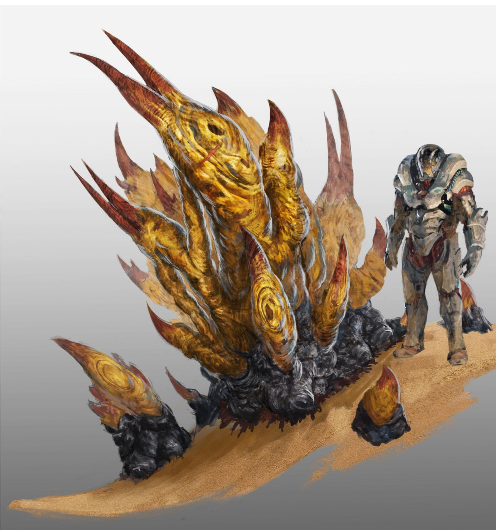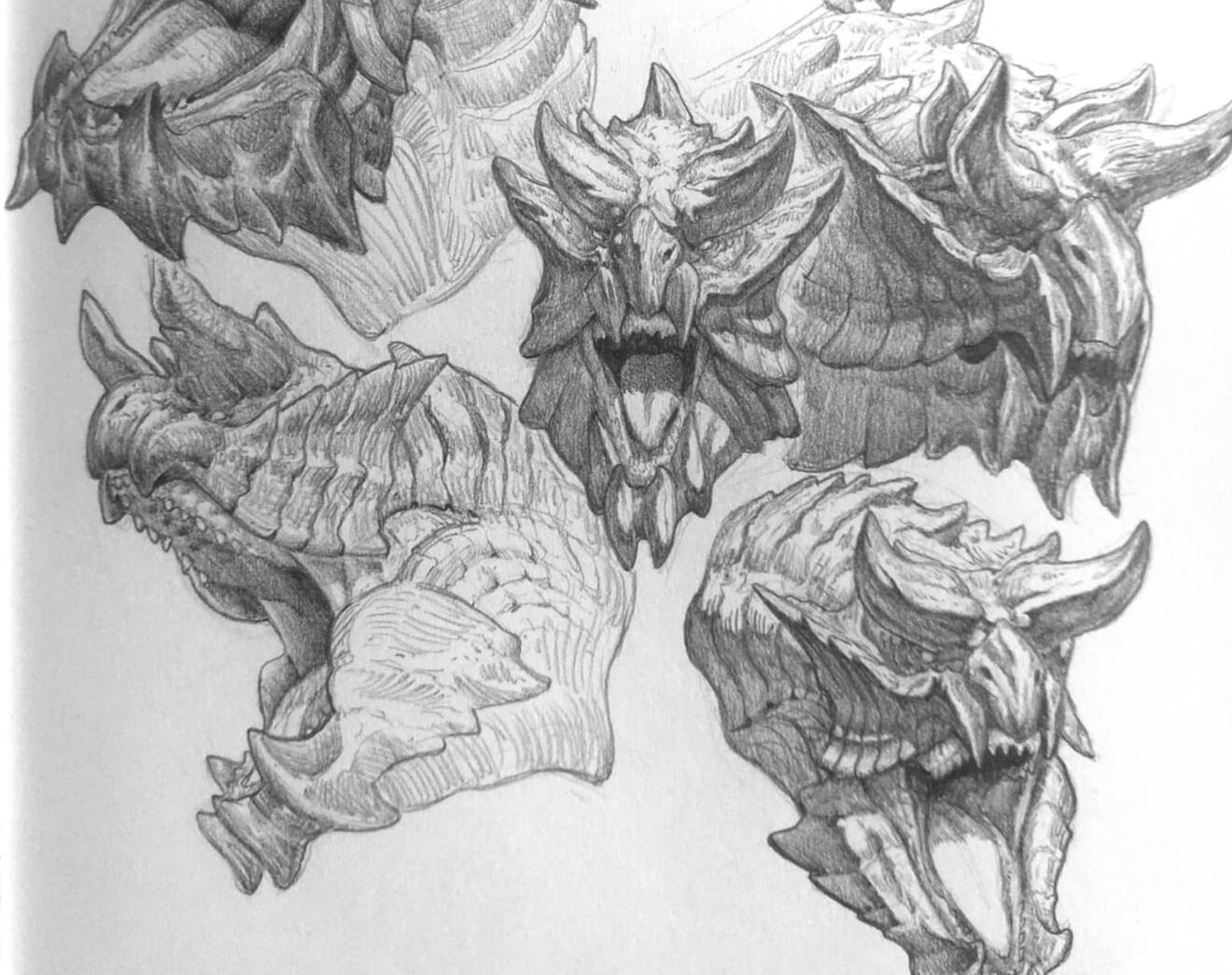 Since the head is the focal point of the creature, I explored numerous design iterations—blending raw power with the concept of transformation to surprise the player when the monster burrows into the sand. I wanted to maintain an aggressive aesthetic while also creating a solid, armor-like structure to protect the head. This led me to rethink the facial design by removing the external plates and scales, revealing a striking red face that contrasts with the protective horn, which folds down over it like a shield.